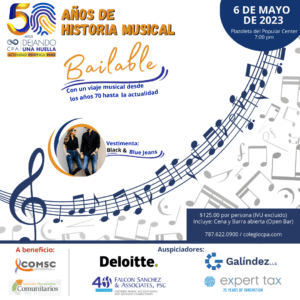 También seguimos con la coordinación de nuestras actividades anuales, como la Actividad Benéfica “50 Años de Historia Musical”. Los espero el sábado, 6 de mayo en la Plazoleta del Popular Center para juntos apoyar a Community Organization of Multiple Sclerosis & Cancer; y Asesores Financieros Comunitarios. Pueden adquirir sus boletos en nuestra página web: https://www.colegiocpa.com/account/#calendar/event/75440. También pueden comunicarse con los presidentes de Comités o miembros de la Junta de Gobierno del Colegio de CPA para adquirirlos.