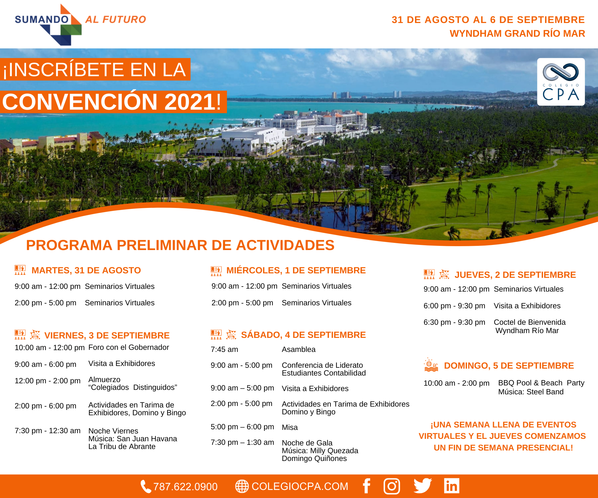 Del 31 de agosto al 6 de septiembre participa de una semana llena de seminarios virtuales, eventos y más con un fin de semana presencial en el Wyndham Grand Rio Mar Puerto Rico Golf & Beach Resort. Opriman aquí para ver el calendario de eventos. Los interesados en inscribirse tienen hasta el 15 de julio para aprovechar nuestros precios especiales.
