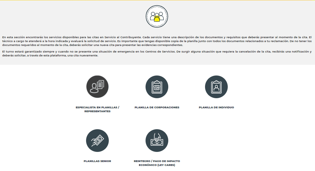 Para solicitar las citas en línea, los Especialistas en Planillas/Representantes deberán acceder a hacienda.turnospr.com y seleccionar el enlace SERVICIO AL CONTRIBUYENTE y luego seleccionar el botón Especialistas en Planillas/Representantes y seguir las instrucciones en el sistema, según se ilustra a continuación: